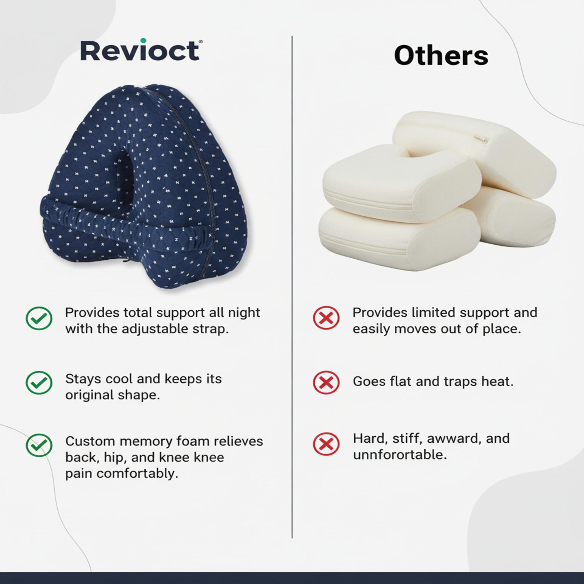 Regular pillows tend to flatten, shift, or fall out of place during sleep. Revioct™ is contoured specifically for leg alignment, made with high-density memory foam, and includes a secure strap to help maintain proper positioning all night.